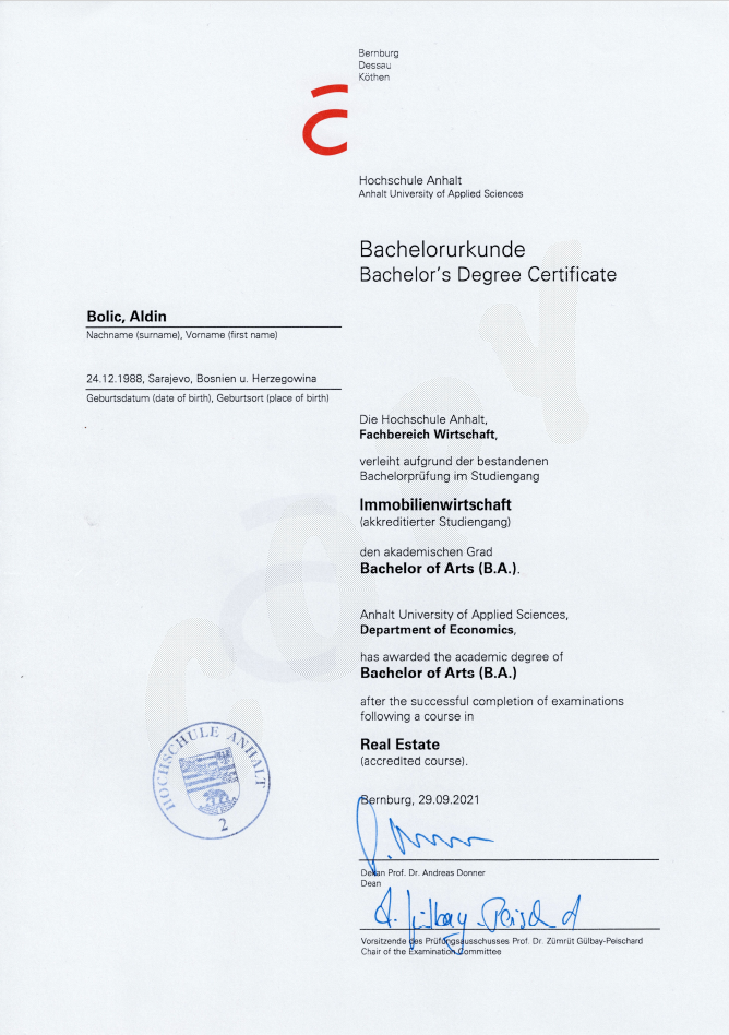 Geboren in Sarajevo und aufgewachsen in meiner Wahlheimat Ehingen an der Donau, führte mich mein Weg in meinen späten Zwanzigern für mein Studium der Immobilienwirtschaft nach Bernburg an der Saale. Mein Bachelorstudium an der Hochschule Anhalt schloss ich mit hervorragenden Ergebnissen ab.